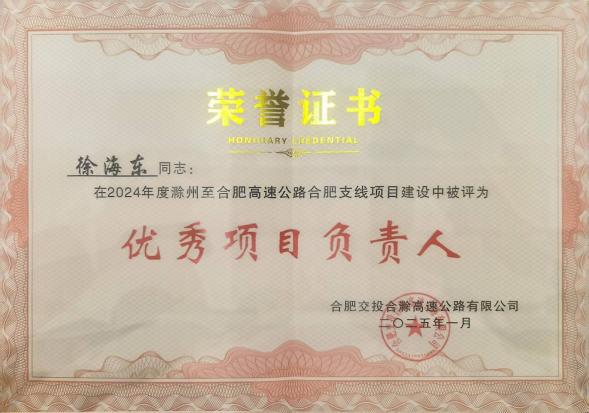 近日,合肥交投合滁高速公路舉辦2024年度總結大會暨表彰大會。滁合支線項目榮獲2024年度“先進集體”稱號,徐海東同志榮獲“優秀項目負責人”稱號,張興強、王盛楠、耿貝貝同志榮獲先進個人稱號。