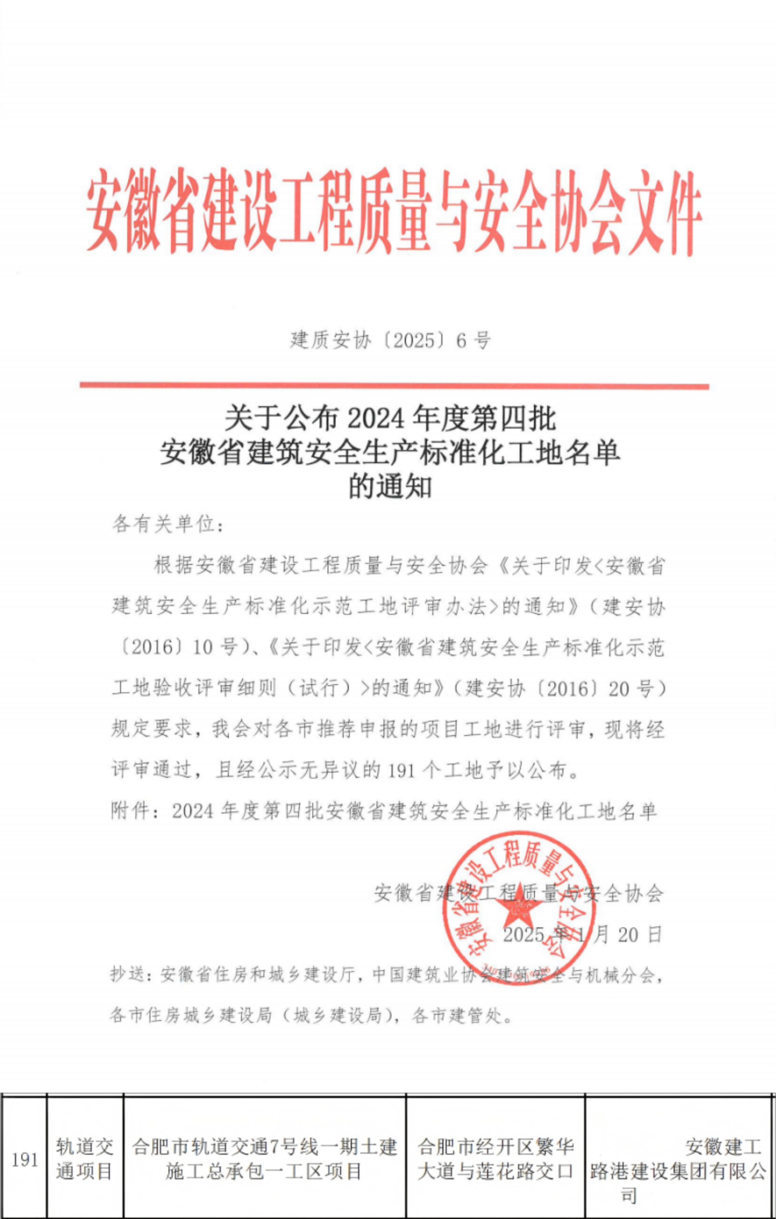 近日,從安徽省建設(shè)工程質(zhì)量與安全協(xié)會(huì)傳來(lái)喜訊,建工路港承建的合肥市軌道交通7號(hào)線項(xiàng)目榮獲2024年度第四批“安徽省建筑安全生產(chǎn)標(biāo)準(zhǔn)化工地”稱號(hào),是此次唯一獲得該稱號(hào)的軌道交通工程項(xiàng)目。