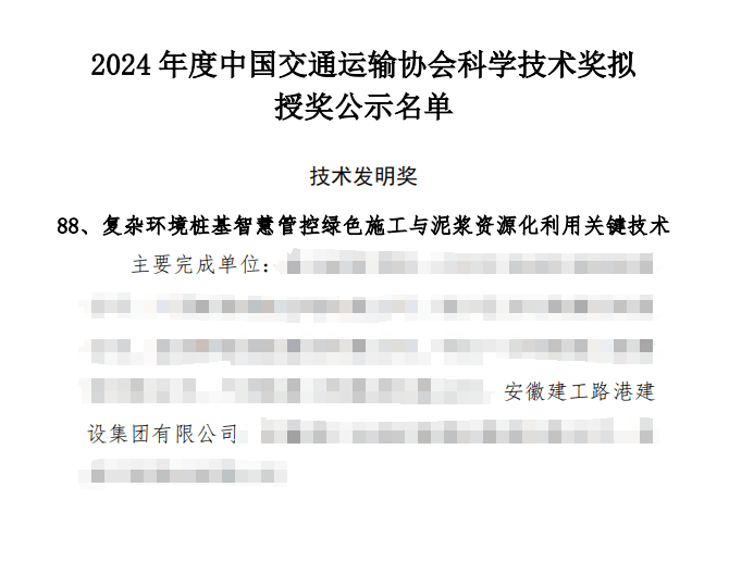 近日,中國交通運輸協會公布了2024年度科學技術獎獲獎名單,建工路港“復雜環境樁基智慧管控綠色施工與泥漿資源化利用關鍵技術”榮獲技術發明獎一等獎。
