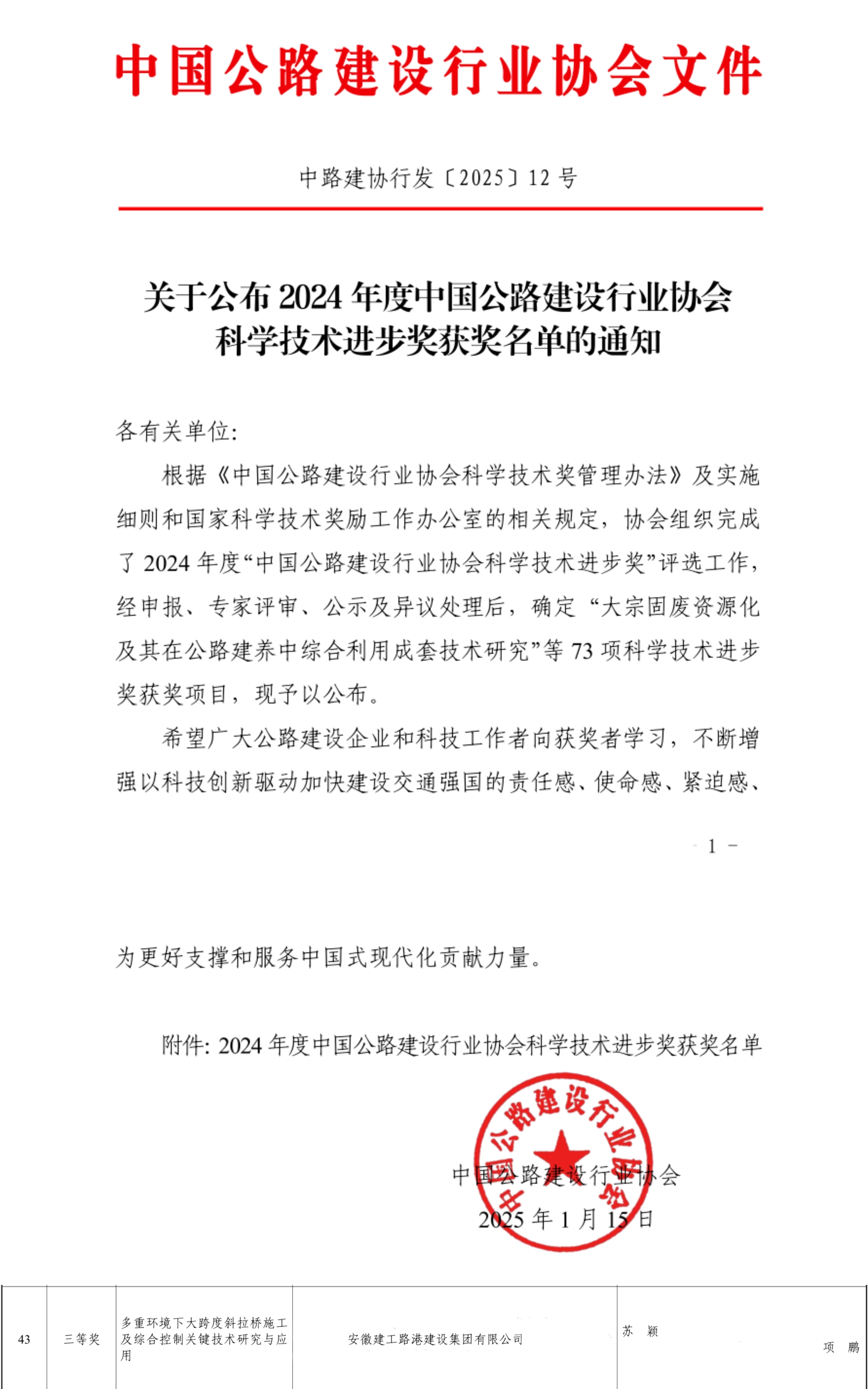 中國公路建設行業協會科學技術進步獎是經國家科學技術獎勵辦公室批準設立的社會科技獎項,代表我國公路工程技術發展的杰出成果,是公路科技創新領域中極高的榮譽。
