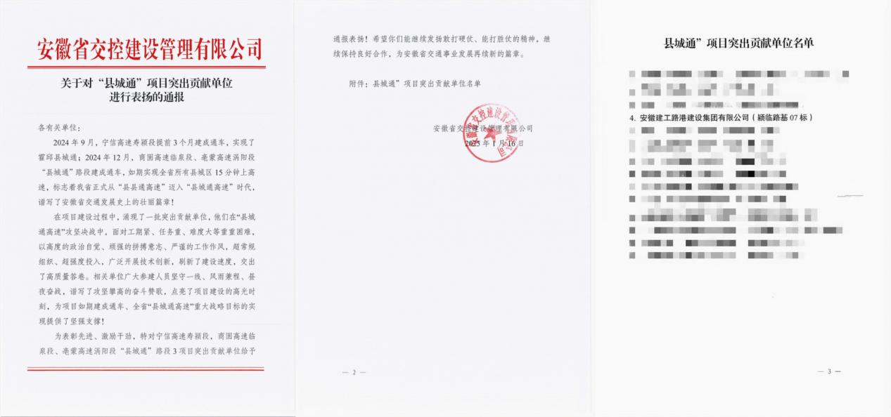 近日,一分公司合周高速潁臨路基07標“縣城通”段項目收到來自業主單位安徽省交控建設管理有限公司的通報表揚。