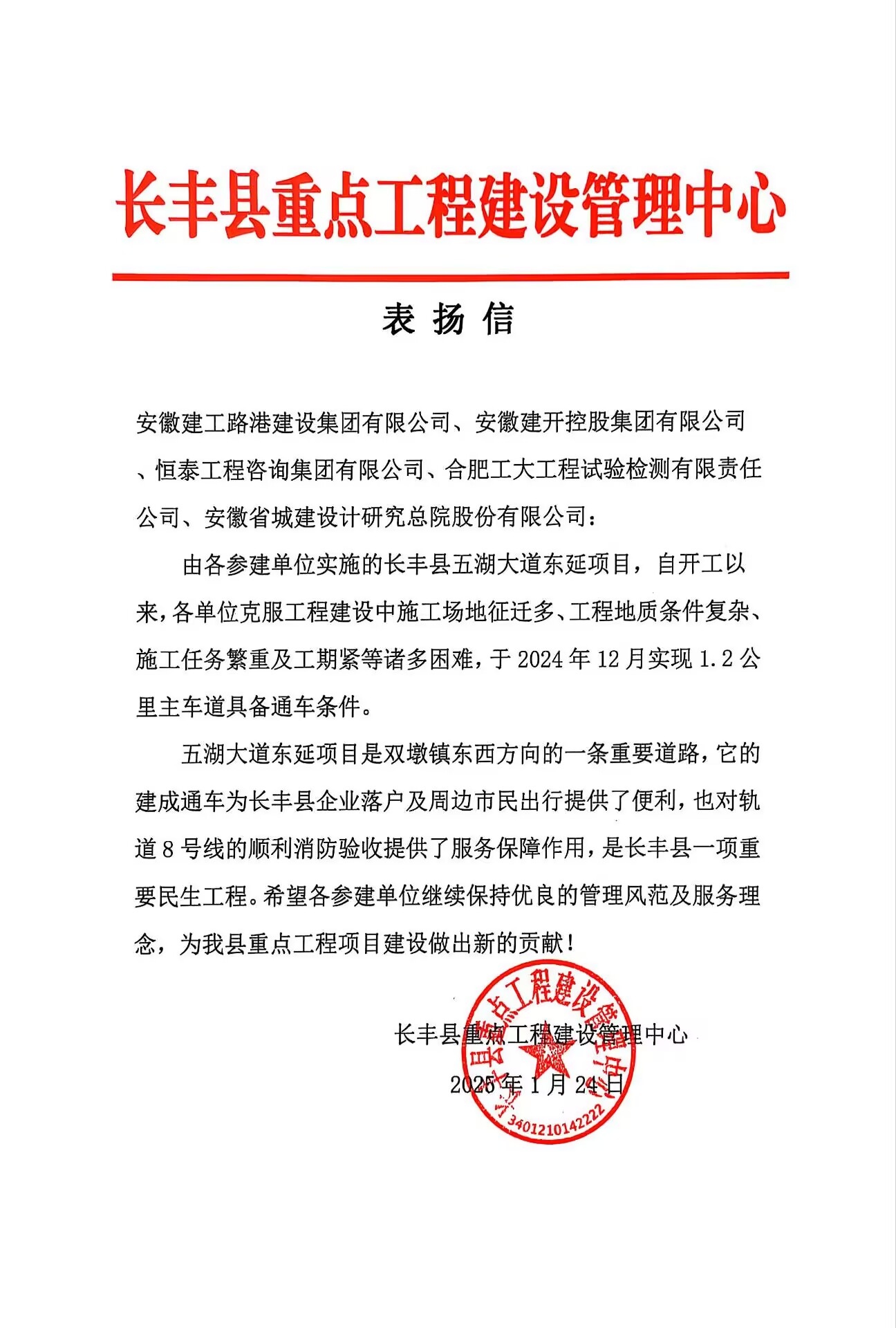 1月24日,建工路港長豐縣五湖大道項目喜獲縣重點工程建設管理中心表揚信。