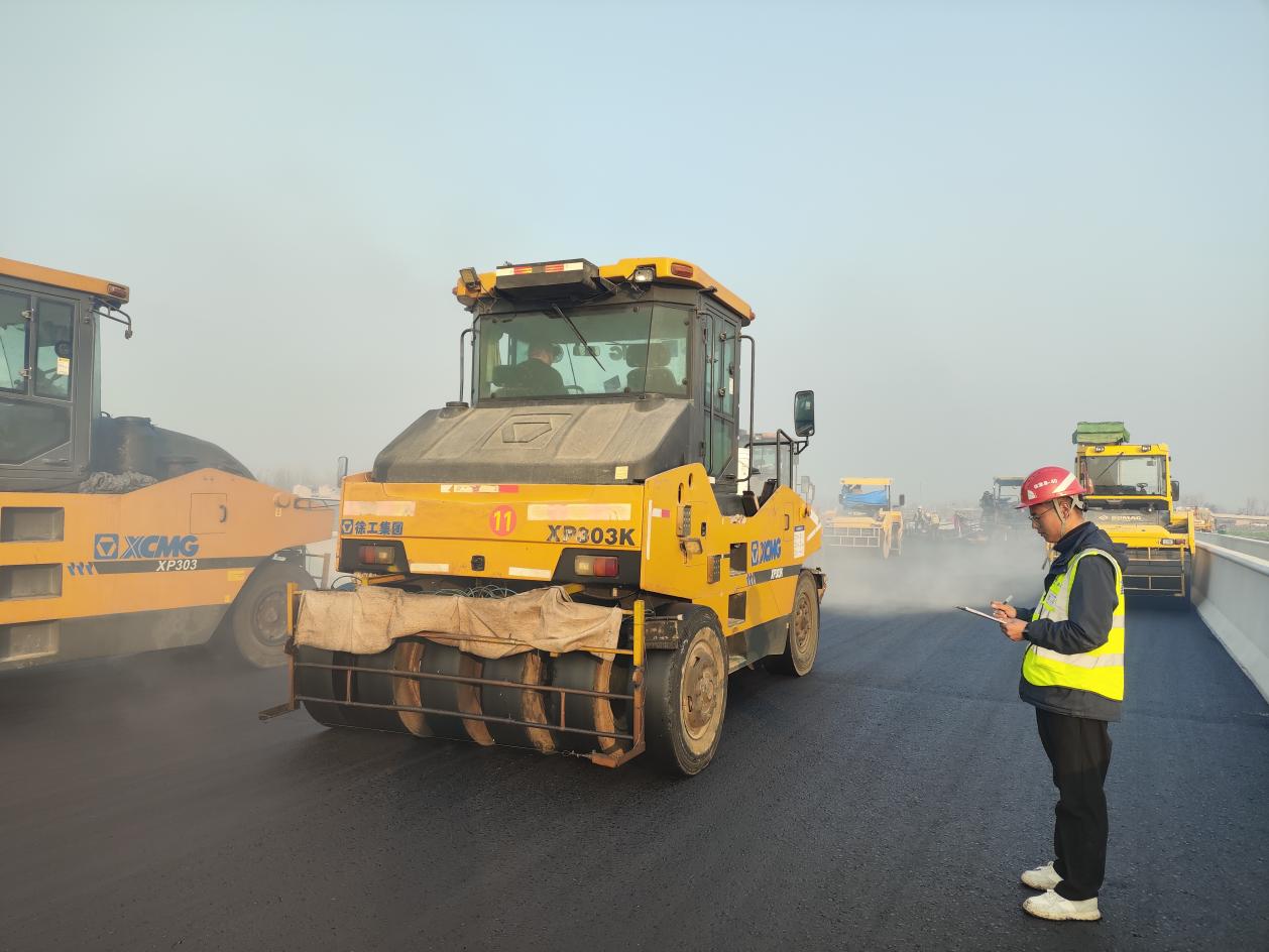 在冬日的寒風中,建工路港徐淮阜高速公路宿州段路面01標項目現場卻是一片熱火朝天的景象。在K7+300路段、K4+500等路段水穩施工現場,滿載瀝青混合料的車輛往來穿梭,滾燙的瀝青被精準傾倒于施工區域,大型碾壓設備緊跟其后,確保每層瀝青均勻壓實。