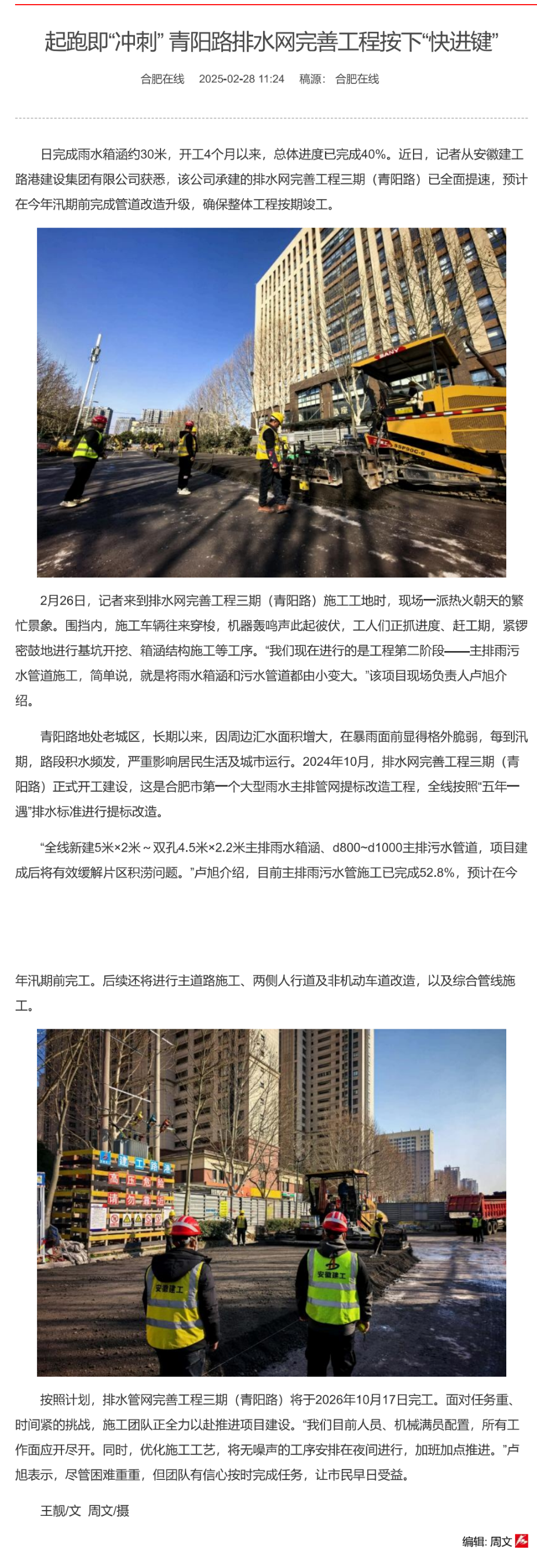 近日,建工路港青陽路排水網(wǎng)完善工程建設(shè)再提速,力爭高質(zhì)量完成任務(wù),讓市民早日受益,合肥日報(bào)以《起跑即“沖刺” 青陽路排水網(wǎng)完善工程按下“快進(jìn)鍵”》為題進(jìn)行了專題報(bào)道。