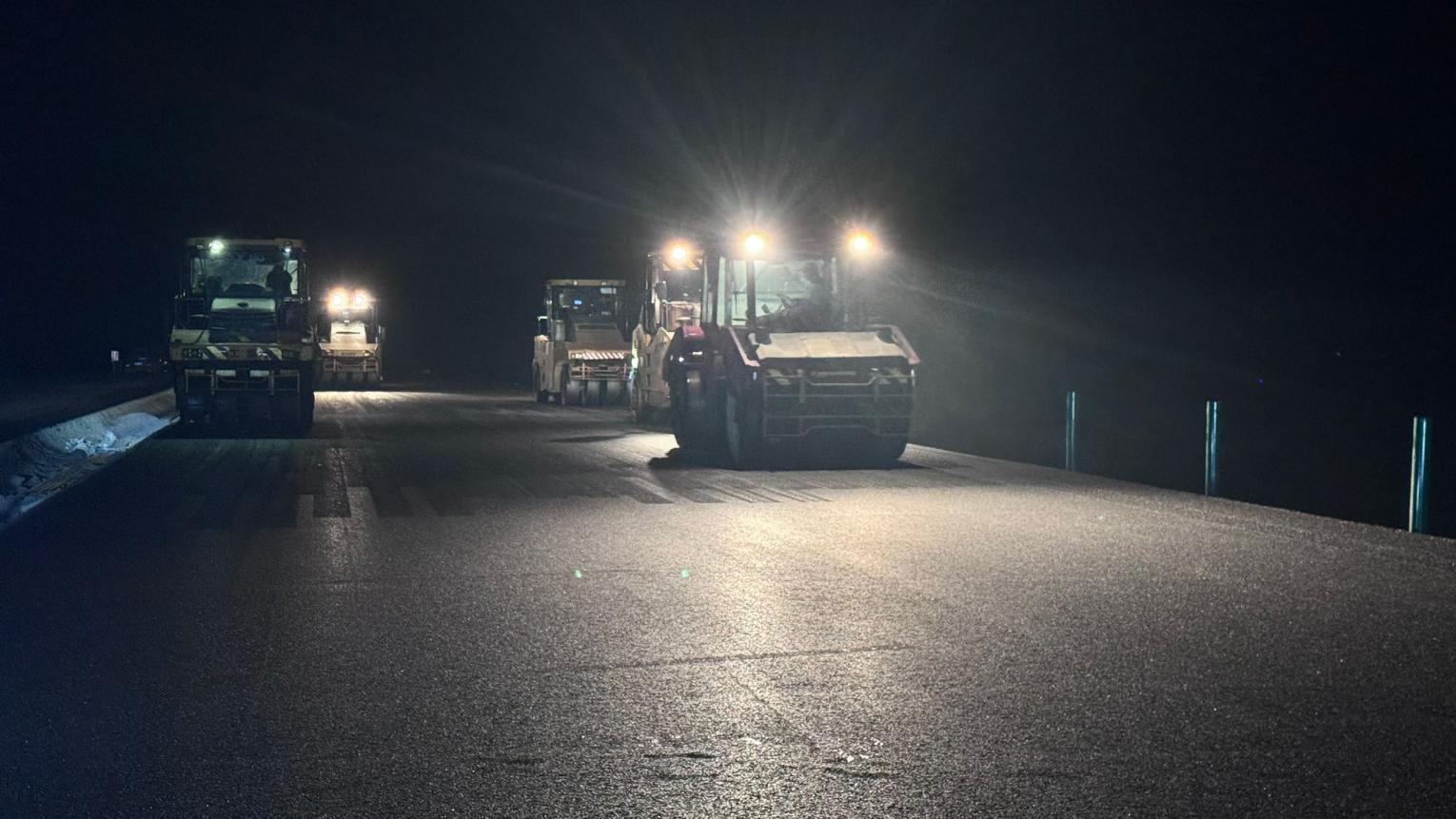 自開春以來,項目團隊緊扣“保安全、提品質、搶工期”目標,科學調配資源,優化施工組織,掀起大干熱潮。通過“5+2”“白+黑”輪班作業,白天機械轟鳴,夜晚燈火通明,以“分秒必爭”的勁頭攻克多項施工難點。截至目前,全線水穩斷面已順利貫通,瀝青鋪設完成約90%,一季度計劃產值6800萬元,實際完成8100萬元,提前完成季度節點任務,為后續工程推進奠定堅實基礎。