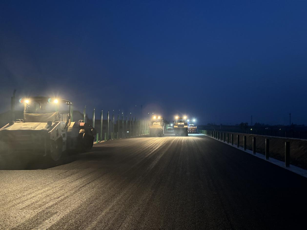 面對地方協調、交叉施工、惡劣天氣等不利因素,項目團隊積極與當地政府單位溝通,迅速調整施工計劃,組織多班組交叉作業,黨員團員帶頭加班加點,日夜奮戰在施工一線,自2024年10月至今,水穩層完成總工程量的83%,瀝青攤鋪完成總工程量的90%,以高效施工全力推進項目建設。