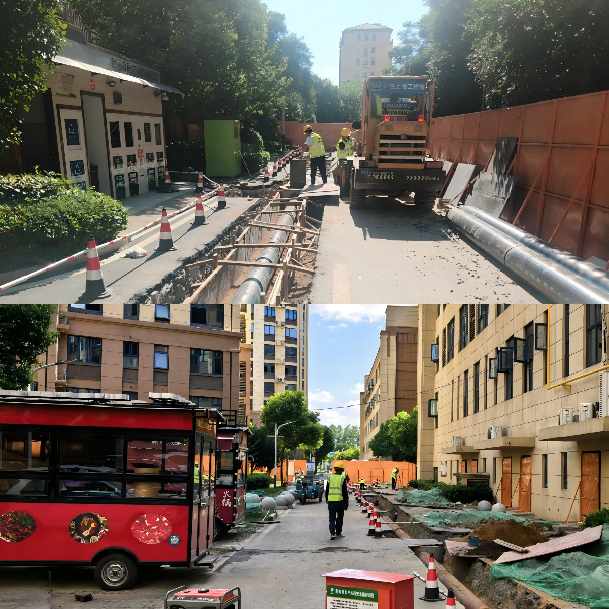 掛圖作戰倒排工期,打出精準推進“組合拳”。項目部將工程節點細化到周、責任到人,實時更新施工動態,形成 “目標倒逼進度、進度倒逼責任”的良性循環。針對地下管線縱橫交錯、小區環境敏感復雜等難點,項目部多次組織專題研討會,嚴格執行圖紙規范,重點把控管道接口密封性、溝槽回填密實度等關鍵工序,在特定路段采用非開挖頂管施工工藝,最大限度減少對路面交通和周邊環境的影響。