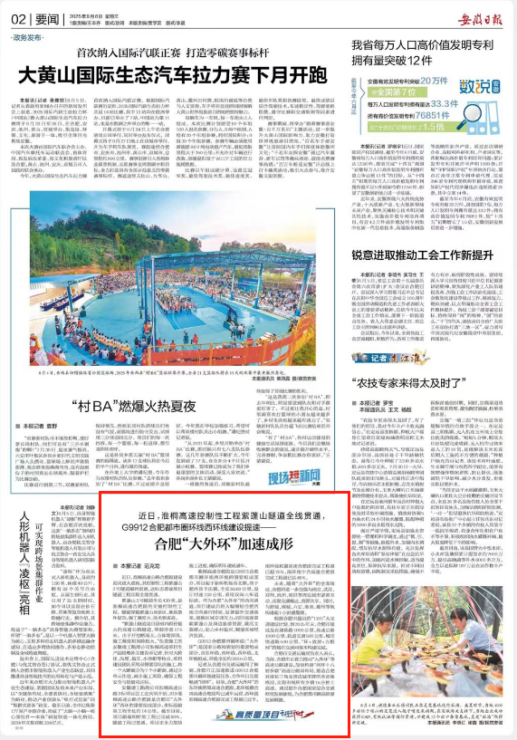 8月6日,安徽日?qǐng)?bào)以“近日,淮桐高速控制性工程紫蓬山隧道全線貫通,G9912合肥都市圈環(huán)線西環(huán)線建設(shè)提速——合肥'大外環(huán)'加速成形”為題,專題報(bào)道了由建工路港公司承建的淮桐高速項(xiàng)目建設(shè)進(jìn)展情況。