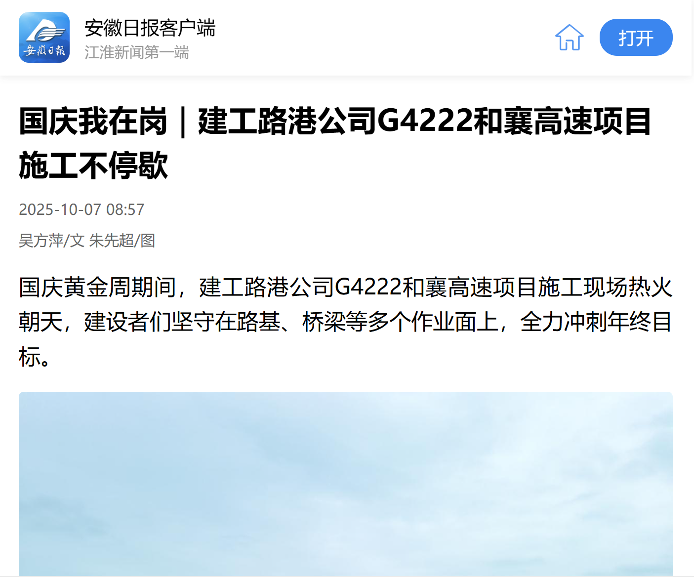 中秋國慶“雙節”期間,安徽日報對建工路港公司承建的G4222和襄高速項目、滁合高速支線項目等重點項目“雙節”攻堅大干進行了報道。