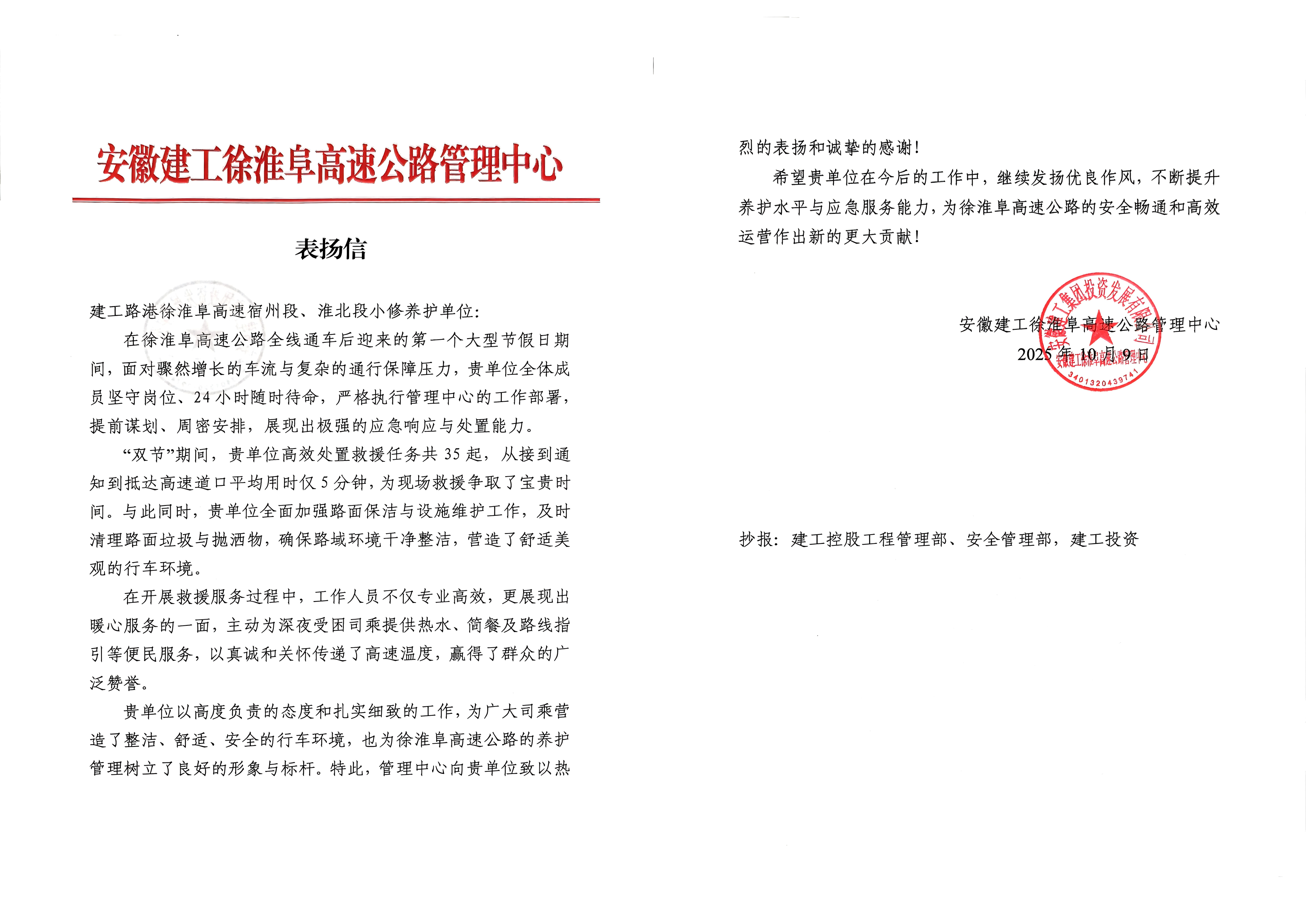 “雙節”保暢踐初心!公司徐淮阜高速小修養護項目部收到表揚信